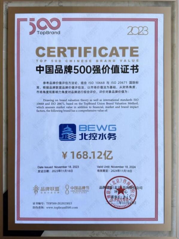 11月18日,2023第十七屆中國品牌節(jié)在杭州舉行。品牌聯(lián)盟(Topbrand Union)發(fā)布了《TopBrand 2023 中國品牌500強》榜單。北控水務獲中國品牌500強榮譽稱號,品牌價值達到168.12億元,這是北控水務連續(xù)兩年入選該榜單。