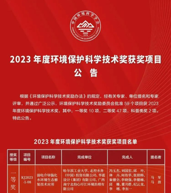 2023年12月25日,中國環(huán)境科學學會發(fā)布《2023年度環(huán)境保護科學技術(shù)獎獲獎項目公告》,北控水務參與申報的“弱電介導強化水環(huán)境生態(tài)修復技術(shù)應用”榮獲一等獎。本次共批準59個項目,其中一等獎10項,二等獎47項,科普類獎2項。