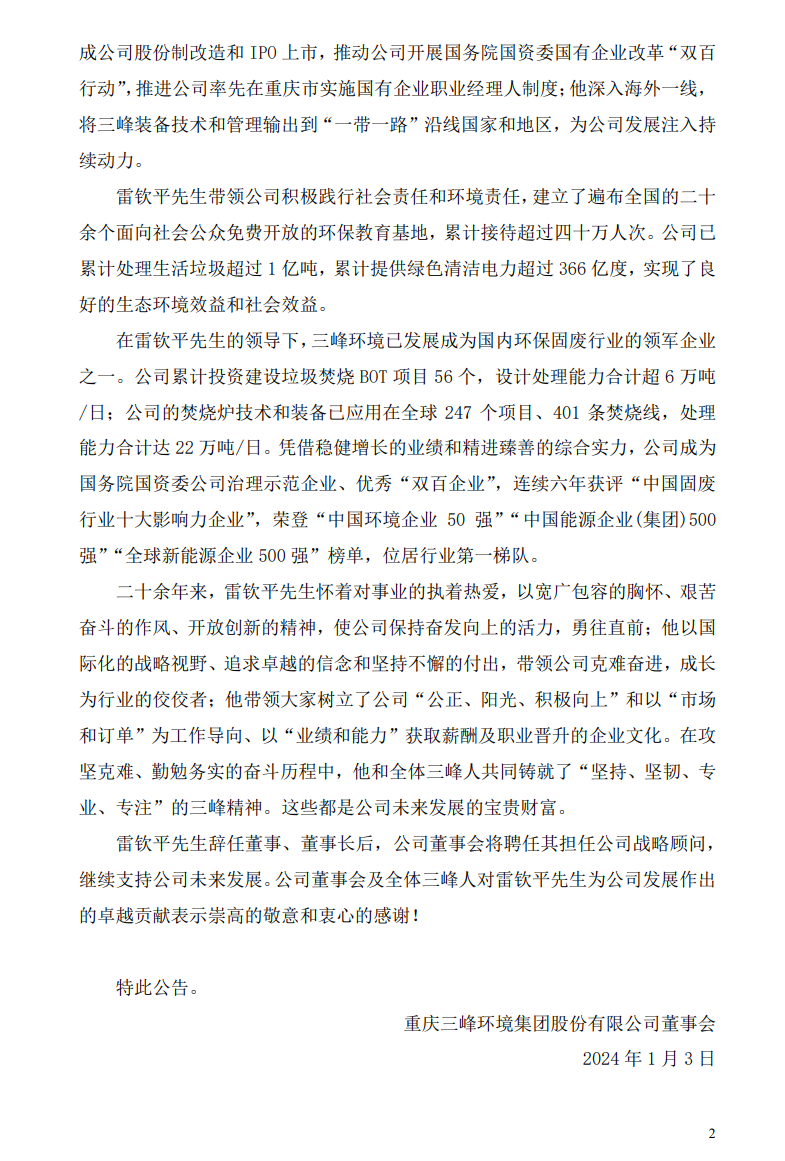 雷欽平辭去重慶三峰環(huán)境集團股份有限公司(以下簡稱“三峰環(huán)境”)董事、董事長職務。
