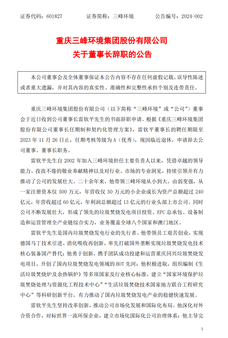 1月3日,三峰環(huán)境發(fā)布公告稱,公司董事會于近日收到董事長雷欽平先生的書面辭職申請。根據(jù)《重慶三峰環(huán)境集團股份有限公司董事長任期制和契約化管理方案》,雷欽平董事長的聘任期限至2023年11月26日止,任期考核等級為A(優(yōu)秀),現(xiàn)因臨近退休,申請辭去公司董事、董事長職務。