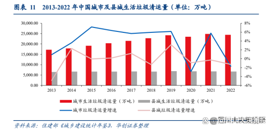 量為 2.44 億噸,并連續(xù)兩年超過 2019 年受影響前的 2.42 億噸,疫情對生活垃圾清運量的負(fù)向影響得到緩解。近 10 年我國鄉(xiāng)村生活垃圾處理率不斷提高,根據(jù)《2022 城鄉(xiāng)建設(shè)統(tǒng)計年鑒》,農(nóng)村地區(qū)生活垃圾處理率已達(dá) 82.99%。相比城市而言,農(nóng)村的垃圾產(chǎn)生規(guī)模和人均垃圾產(chǎn)生量遠(yuǎn)遠(yuǎn)偏低,同時存在鄉(xiāng)村人口萎縮的情況,但由于農(nóng)村地區(qū)垃圾收集、處置率存在較大的提高空間,依靠對未處理的垃圾存量的消化和擴大處理覆蓋,未來農(nóng)村垃圾處理規(guī)模的擴張可期。