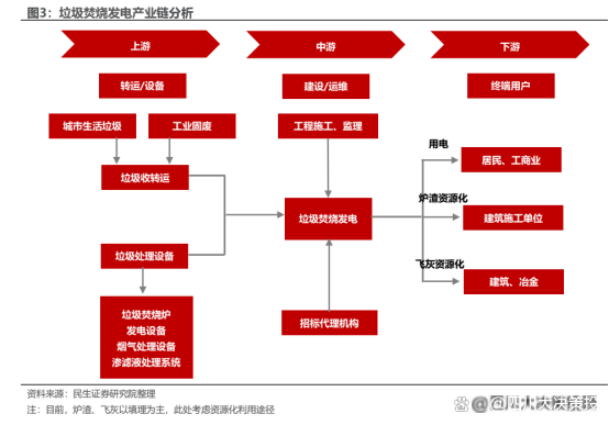 垃圾焚燒發(fā)電企業(yè)上游主要包括環(huán)衛(wèi)服務(wù)(收轉(zhuǎn)運)、垃圾處理設(shè)備;中游包括以垃圾焚燒發(fā)電廠為核心的相關(guān)招標(biāo)代理、建設(shè)、監(jiān)理等機構(gòu);下游既包括用電單位(居民、工商業(yè)等),也包括再生資源化產(chǎn)品用戶(建筑業(yè)、冶煉行業(yè)等)。