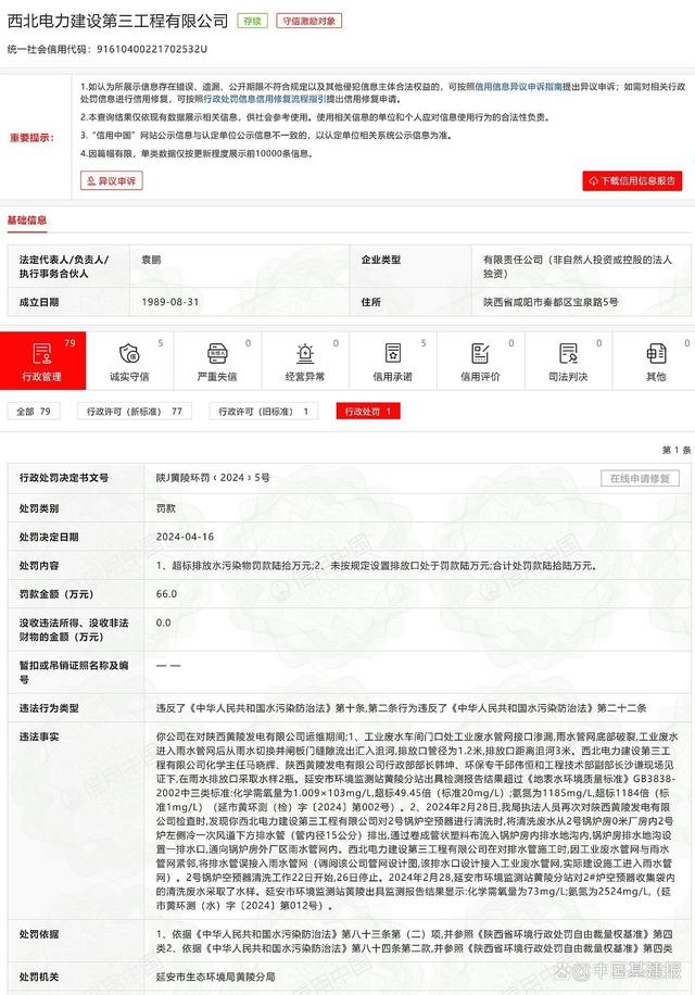 4月27日,本報(bào)從信用中國獲悉,由于違反水污染防治法,近日,西北電力建設(shè)第三工程有限公司被罰款66萬元。