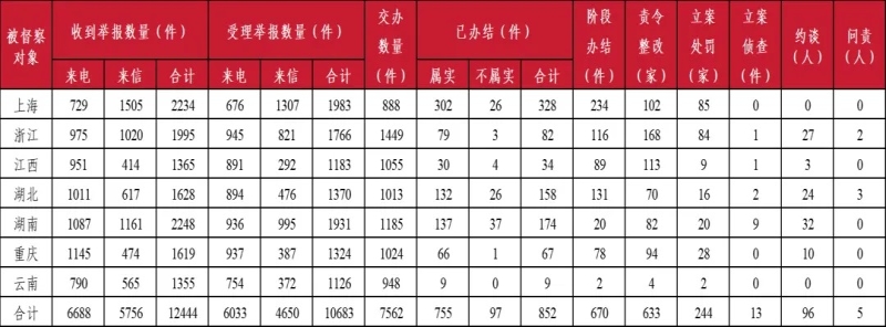 截至5月20日晚20:00,各督察組共收到群眾來電、來信舉報(bào)12444件,受理有效舉報(bào)10683件,經(jīng)梳理合并重復(fù)舉報(bào),累計(jì)向被督察地方轉(zhuǎn)辦7562件;被督察地方已辦結(jié)或階段辦結(jié)1522件,其中立案處罰244家;立案?jìng)刹?3件;約談黨政領(lǐng)導(dǎo)干部96人,問責(zé)黨政領(lǐng)導(dǎo)干部5人。