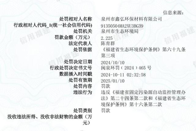 臺(tái)海網(wǎng)10月12日訊 根據(jù)泉州市生態(tài)環(huán)境局近日發(fā)布的行政處罰信息公開表(閩泉環(huán)罰(2024)465號(hào))顯示,因當(dāng)事人違反《福建省固定污染源自動(dòng)監(jiān)控管理辦法》第二十四條第二款和《福建省生態(tài)環(huán)境保護(hù)條例》第十六條第二款,對(duì)泉州市鑫弘環(huán)保材料有限公司處以人民幣22250元罰款。