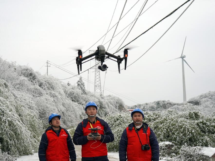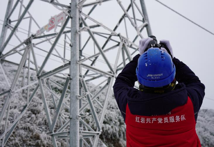 中國電力網(wǎng)訊 “110千伏四黎線今日最大覆冰厚度7.9毫米,目前風(fēng)速3.5米每秒,溫度零下4度……”“小心一點,要走兩邊有草叢的地方,中間的道路結(jié)冰了,容易滑倒。”1月9日,國網(wǎng)重慶武隆供電公司輸電運維檢修班成員吳鼎、趙樓等人來到武隆區(qū)和順鎮(zhèn)四眼坪鄉(xiāng)對覆冰線路開展特殊巡視。在白雪皚皚的四眼坪,國家電網(wǎng)紅巖共產(chǎn)黨員服務(wù)隊隊服的顏色成了冰雪世界里最靚麗的一抹紅,他們手拿著無人機、砍刀、繩索、望遠鏡、風(fēng)速儀等設(shè)備再一次踏入他們熟悉的“冰雪戰(zhàn)場”。