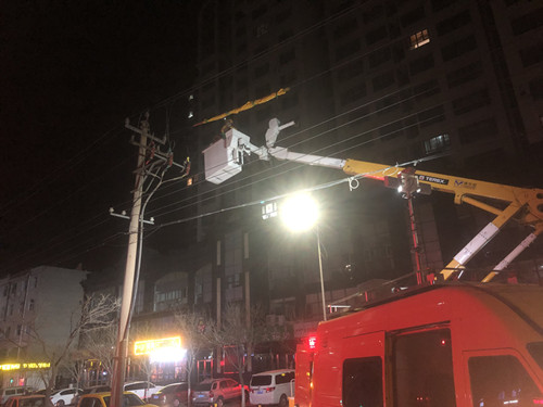 在應(yīng)急搶修燈的照明下,絕緣斗臂車絕緣臂緩緩升起,作業(yè)人員緩緩向作業(yè)點(diǎn)靠近,由于是夜間帶電搶修,作業(yè)能見度等條件較為不足,工作負(fù)責(zé)人不敢有一絲大意,嚴(yán)密監(jiān)護(hù)作業(yè)人員的行為。兩名帶電作業(yè)操作人員站在10多米高空的作業(yè)斗內(nèi),小心翼翼的包絕緣毯,套絕緣管,更換燒壞的熔斷器……一道道作業(yè)流程嚴(yán)謹(jǐn)有序,經(jīng)過3個半小時的連續(xù)搶修,故障搶修順利結(jié)束,受損線路恢復(fù)供電。