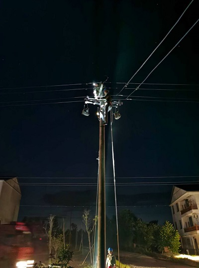 事故發(fā)生后,龔坊供電所所長(zhǎng)楊程立即組織人員第一時(shí)間趕赴現(xiàn)場(chǎng),經(jīng)現(xiàn)場(chǎng)查勘后制定搶修方案,在確保人身安全的前提下,連夜開(kāi)展搶修工作。在搶修現(xiàn)場(chǎng),做好安全措施后,樂(lè)安縣供電公司龔坊供電所10余名員工協(xié)同合作,對(duì)損毀的斷桿、導(dǎo)線、橫擔(dān)進(jìn)行清理,重新立桿、安裝新的拉線、T接導(dǎo)線……搶修工作有條不紊的進(jìn)行。