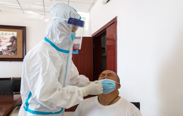 此次核酸檢測方式為鼻咽拭子。該院體檢中心主任孫逾介紹,人體咽部分區(qū)包括鼻咽、口咽、喉咽,三者的黏膜是連續(xù)的,均屬于上呼吸道區(qū)域。采用鼻咽拭子取樣時,棉簽可以在咽部停留較長的時間,操作者不需直視患者口腔,暴露風險低。接受檢測人員下拉口罩僅露出鼻孔,基本不出現(xiàn)咽反射,能夠獲得足量的采集標本,有助于提高核酸檢測的準確率。