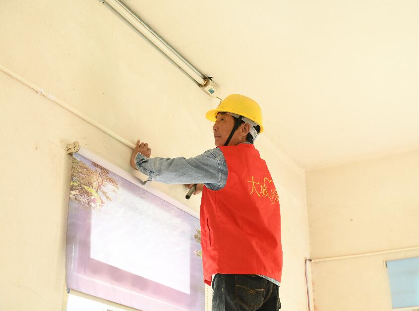 當天,根據(jù)前期方案,志愿者把露在墻上的舊線全部拆除,鋪設新線、套進線管,并將其牢牢地固定在墻上,運用各種兩通、三通接頭使整個線路看起來橫平豎直,美觀大方。同時,每個出線口都裝上插座和開關底座,便于墻面粉刷完畢后進行插座和開關安裝。