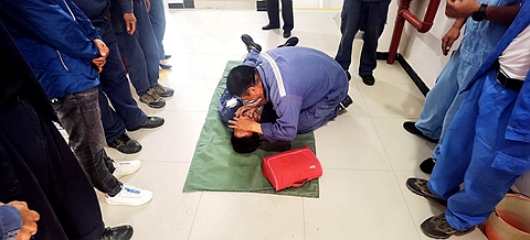 演練模擬大寺鄉(xiāng)發(fā)生6.5級破壞性地震,供電所辦公樓開始搖晃,指揮長嚴(yán)世莊大聲呼喊吹哨,各樓層內(nèi)所有人員立即采取正確的避震措施,迅速抱頭尋找最近的墻角、柱角、堅(jiān)固高大的桌下、柜旁或開間小的衛(wèi)生間、內(nèi)承重墻墻角蹲下、抱頭、閉眼,抓牢或握實(shí)以盡量固定身體,使用安全帽等保護(hù)頭部,降低身體重心。隨著指揮長第二次呼喊緊急撤離,各樓層緊急組織人員安全迅速從安全指定安全通道疏散到指定聚集點(diǎn),過程中員工互相呼喚、提醒避震。撤離后清點(diǎn)發(fā)現(xiàn)1人失蹤,急救組立刻對失蹤人員進(jìn)行搜救,搜救人員在二樓辦公室發(fā)現(xiàn)失蹤人躺在地上,左手臂被傾倒的辦公桌壓住,造成骨折,同時(shí)發(fā)現(xiàn)兩根0.22KV電線(鋁塑線)達(dá)在傷員身上,并正通有電源,傷員無意識,心跳呼吸停止同時(shí)發(fā)生人員觸電,搜救人員立即斷開有關(guān)電源,用木棒挑開電線,迅速轉(zhuǎn)移傷員至安全地帶后對其進(jìn)行心肺復(fù)蘇和外傷急救,并撥打120急救電話。經(jīng)全力搶救,傷員已恢復(fù)自主心跳和呼吸,搶救人員對其進(jìn)行外傷包扎后就地觀察,等待120急救人員到來,同時(shí)有人員報(bào)告一樓安全工器具室發(fā)生火災(zāi),指揮組迅速組織人員對著火點(diǎn)進(jìn)行滅火器滅火。