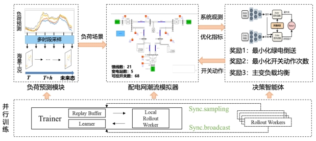 國網浙江省電力有限公司紹興供電公司聚焦清潔能源消納優(yōu)化控制和負載均衡目標,聯合浙江思極和阿里云等公司一起訓練電力調度人工智能導航員——“調度智能體”。采用阿里云“云邊一體”數字化基礎設施和強化學習AI 核心產品,結合源網荷儲示范工程,從“網”的適應性角度提出新能源消納通道靈活調節(jié)的思路,采用分布式近端策略優(yōu)化(PPO)為核心算法,通過預測抽樣+潮流仿真+強化學習訓練迭代,生成地區(qū)主、配網方式調節(jié)策略,實現示范區(qū)域內電網運行方式面向新能源消納的自適應調節(jié)。