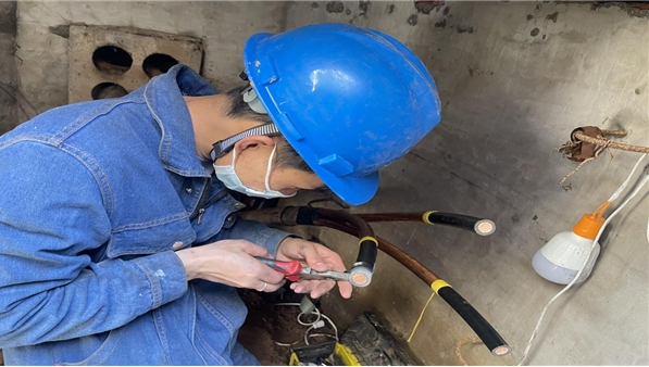 “進(jìn)入電纜井前一定要檢測有限空間內(nèi)氣體含量是否符合標(biāo)準(zhǔn),注意安全。”在工作負(fù)責(zé)人劉伯彥的提醒下,“全副武裝”的工作人員順著爬梯進(jìn)入電纜井。在落實(shí)防疫措施的同時(shí),明確工作任務(wù),清楚危險(xiǎn)點(diǎn),確認(rèn)安全措施無誤,仔細(xì)核對線路名稱,確保工作人員“零違章”作業(yè)。這次工作的難點(diǎn)是要在9.5小時(shí)內(nèi)完成4個(gè)熔接接頭的更換工作,電纜井內(nèi)空間狹窄,電纜錯(cuò)綜復(fù)雜,分為3個(gè)小組同時(shí)進(jìn)行,時(shí)間緊任務(wù)重,這不僅需要合理的檢修方案,更需要每位工作人員的高效配合,必須在批準(zhǔn)的停電時(shí)間內(nèi)完成,對檢修人員的技術(shù)水平、體能狀態(tài)也是一個(gè)較大的考驗(yàn)。