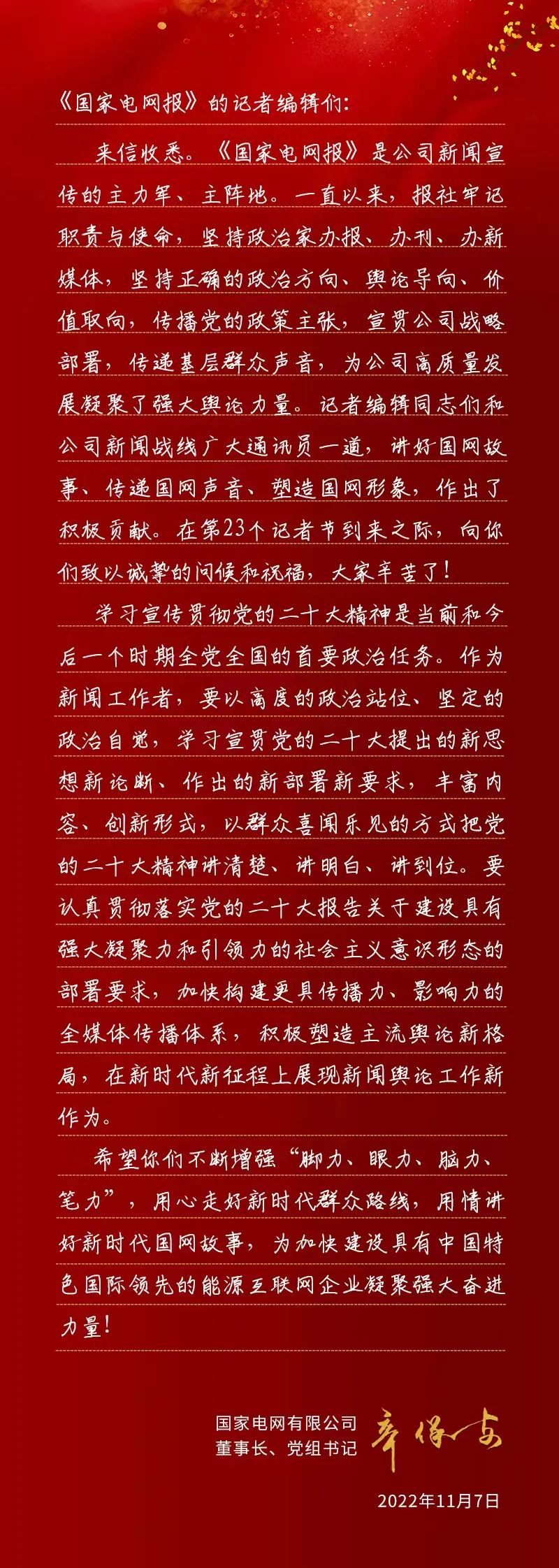 在第23個中國記者節(jié)到來之際,11月7日,國家電網(wǎng)有限公司董事長、黨組書記辛保安給《國家電網(wǎng)報》的記者編輯回信,要求認真學(xué)習(xí)宣傳貫徹黨的二十大精神,不斷增強腳力、眼力、腦力、筆力,用心走好新時代群眾路線,用情講好新時代國網(wǎng)故事,為加快建設(shè)具有中國特色國際領(lǐng)先的能源互聯(lián)網(wǎng)企業(yè)凝聚強大奮進力量。
