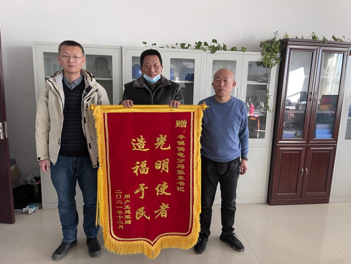 中國電力網(wǎng)訊 12月1日,豐鎮(zhèn)市黑土臺31號村養(yǎng)殖戶王建軍將一面“光明使者 造福于民”的錦旗送到豐鎮(zhèn)供電分局,對該分局盡職盡責、熱情周到的服務(wù)表示高度贊揚和誠摯感謝。