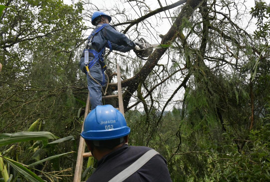 在搶修現(xiàn)場,在做好一系列安全措施以后,配電中心搶修人員用油鋸鋸斷搭在線路的樹木,再登上電桿,拆除原來的線路和刀閘,隨后更換故障刀閘,重新架設(shè)線路,恢復(fù)送電……搶修中,工作人員克服雨天路滑、天氣暴熱、搶修不易等困難,同時在當(dāng)?shù)卮迕竦亩αχС窒?,?jīng)過三個小時的艱苦鏖戰(zhàn),所有搶修工作圓滿落下帷幕。