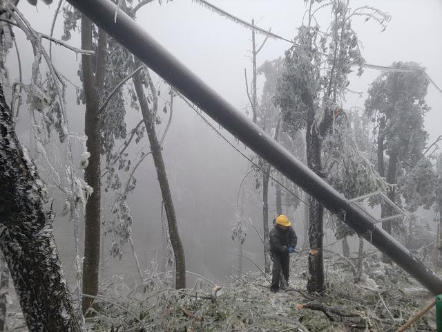 為確保景區(qū)供電需求和游客安全,該公司組織30余名黨員干部職工兵分三路,一邊緊急調(diào)集大功率發(fā)電機(jī)抬運(yùn)至景區(qū),第一時(shí)間保障該線路用戶可靠供電,一邊協(xié)同云陽(yáng)國(guó)家森林管理局、茶陵縣消防救援大隊(duì)緊急開(kāi)展道路疏通搶險(xiǎn),一邊穿冰簾掃障礙,為搶修斷桿線路做準(zhǔn)備。到處是冰碴斷枝的山林里,不斷有晶瑩剔透的冰塊從樹(shù)上掉落,搶修人員一邊用柴刀對(duì)樹(shù)枝進(jìn)行清理,一邊爬冰臥雪艱難前行,清理道路,運(yùn)送桿線搶修物資,在零下冰凍的高山上,分秒必爭(zhēng)地投入到搶修中。