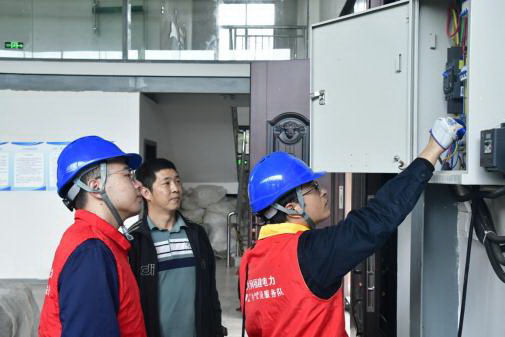 國(guó)網(wǎng)松溪縣供電公司黨員服務(wù)隊(duì)在龍?jiān)床枞~有限公司生產(chǎn)車間檢查用電開關(guān)(蔡政攝)