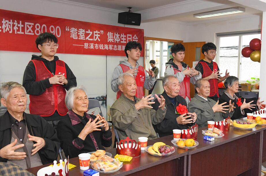 這是慈溪市白果樹社區(qū)第四屆“8090”耄耋老人集體生日會的現(xiàn)場。在重陽節(jié)來臨之際,浙江慈溪市錢海軍志愿服務中心攜同白果樹社區(qū)和寧波大學科學技術(shù)學院,為社區(qū)內(nèi)30余名80歲以上老人們準備了蛋糕、壽面和精彩的節(jié)目表演,提前給老人們過一個集體生日。