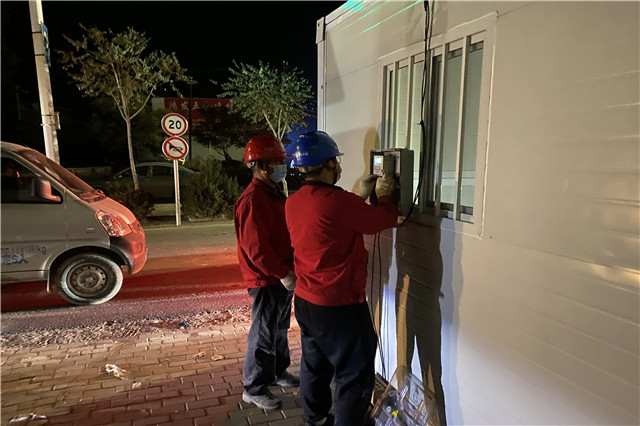 急難險重,黨員先行。疫情監(jiān)測點大多設在村子的交通路口,接電難度較大,為了盡早給臨時防疫小屋送去明亮與溫暖,黨員先鋒隊員們克服地區(qū)跨度遠,環(huán)境復雜、夜間照明不足、夜晚寒冷等種種困難,以高度的政治責任感和使命感,連續(xù)奮戰(zhàn)5個多小時,提前完成了巴音陶亥鎮(zhèn)全部疫情防控檢測站點接電任務。