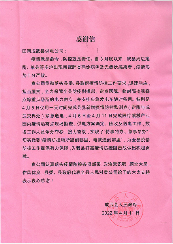 感謝信中說(shuō),自3月底以來(lái),疫情形勢(shì)十分嚴(yán)峻,成武公司貫徹落實(shí)縣委、縣政府疫情防控工作要求,迅速響應(yīng)擔(dān)當(dāng)履責(zé)。工作人員爭(zhēng)分奪秒、接力奮戰(zhàn),實(shí)現(xiàn)了“特事特辦、急事急辦”切實(shí)做到“疫情防控場(chǎng)所建到哪里、電就通到哪里",全力保障全縣防疫指揮部、定點(diǎn)醫(yī)院、臨時(shí)隔離觀察點(diǎn)等重點(diǎn)場(chǎng)所的電力供應(yīng),并安排應(yīng)急發(fā)電車(chē)隨時(shí)備用,體現(xiàn)了政治意識(shí)強(qiáng),顧全大局的優(yōu)良作風(fēng)。