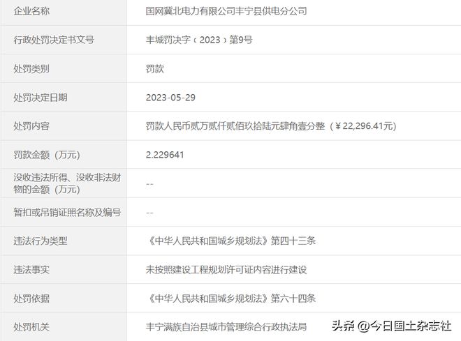 據(jù)河北省承德市豐寧滿族自治縣城市管理綜合行政執(zhí)法局5月29日公布的“豐城罰決字﹝2023﹞第9號(hào)”行政處罰信息顯示,國(guó)網(wǎng)冀北電力有限公司豐寧縣供電分公司因未按照建設(shè)工程規(guī)劃許可證內(nèi)容進(jìn)行建設(shè),被處以罰款2.229641萬(wàn)元。