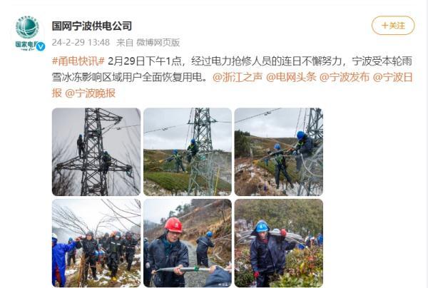 央視網(wǎng)消息:據(jù)@國(guó)網(wǎng)寧波供電公司 微博消息,2月29日下午1點(diǎn),經(jīng)過電力搶修人員的連日不懈努力,寧波受本輪雨雪冰凍影響區(qū)域用戶全面恢復(fù)用電。