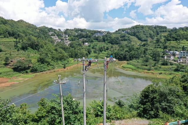 南方電網(wǎng)興仁供電局工作人員對(duì)新田水庫(kù)10千伏龍麻線新田支線線纜進(jìn)行緊線操作。