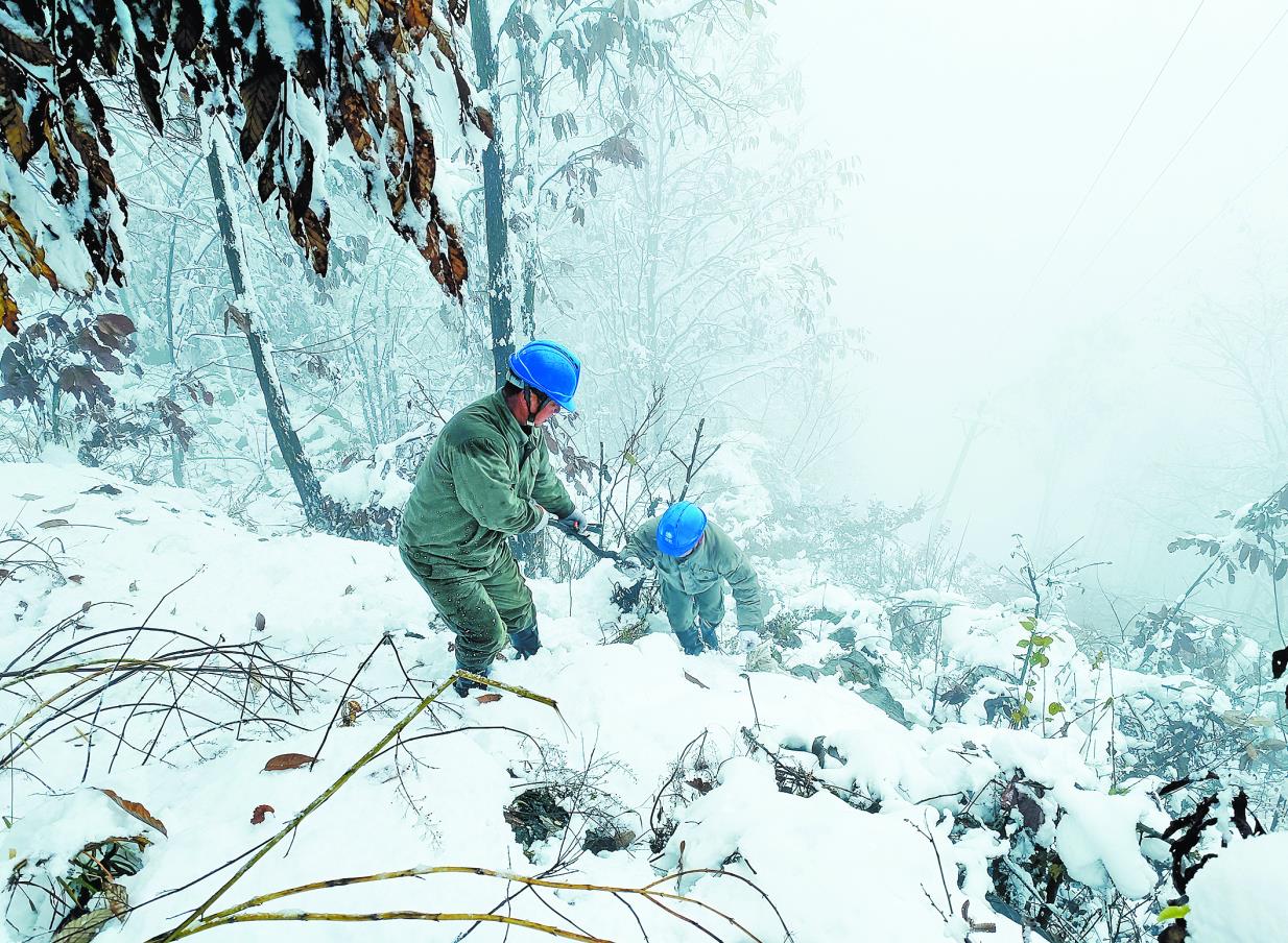 國網(wǎng)鄖西縣供電公司員工在齊膝深的積雪中艱難跋涉,清理線下覆冰嚴(yán)重的樹木隱患。