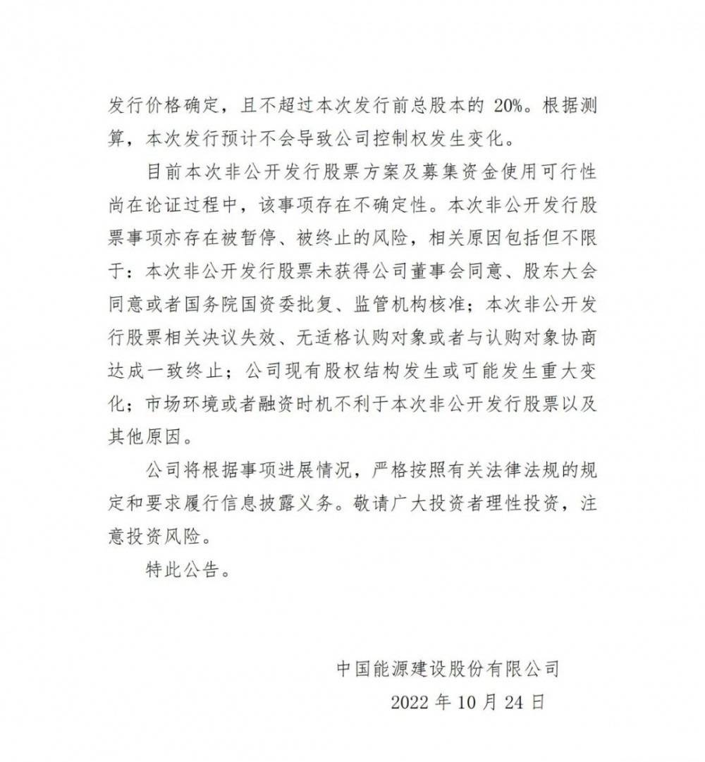 10月23日,中國(guó)能建公告稱(chēng),為助力公司“30·60”戰(zhàn)略目標(biāo)落地,構(gòu)筑新能源、新基建、新產(chǎn)業(yè)“三新”發(fā)展平臺(tái),公司正在籌劃非公開(kāi)發(fā)行A股股票事項(xiàng),擬將募集資金用于以新能源為主的新型綜合能源項(xiàng)目,包括光伏、風(fēng)電、氫能、儲(chǔ)能等新能源一體化、專(zhuān)業(yè)化項(xiàng)目,新能源工程施工項(xiàng)目、新能源重大裝備采購(gòu),以及生態(tài)環(huán)境治理、新型基礎(chǔ)設(shè)施等項(xiàng)目。據(jù)悉,本次募集資金總額在人民幣150億元以?xún)?nèi)。本次非公開(kāi)發(fā)行股票方案最終以經(jīng)公司董事會(huì)、股東大會(huì)批準(zhǔn)及國(guó)務(wù)院國(guó)資委批復(fù)、本公司證券上市地的證券監(jiān)管機(jī)構(gòu)核準(zhǔn)的方案為準(zhǔn)。