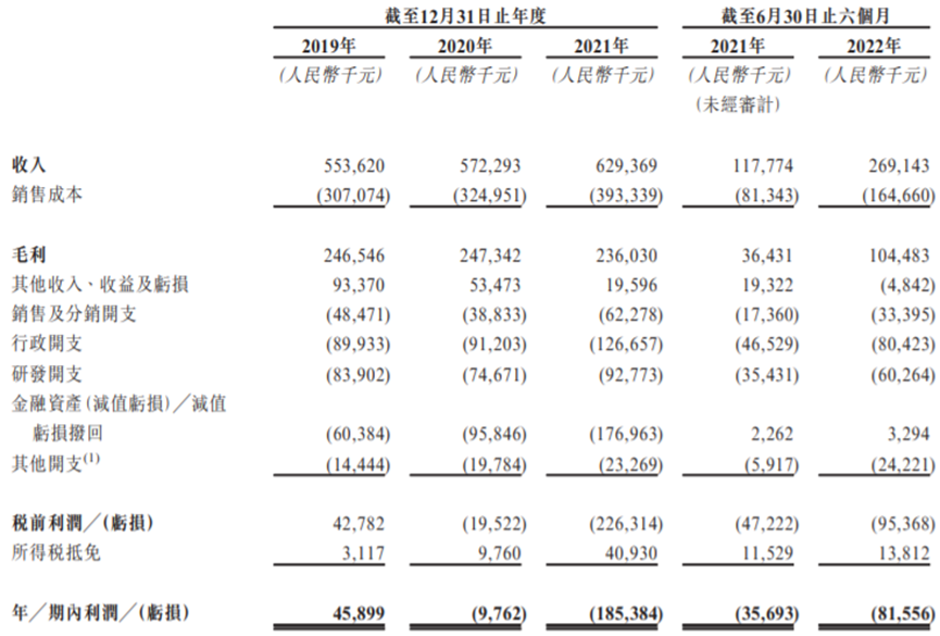 招股書顯示,2019年至2021年,億華通營收分別為約5.54億元、5.72億元、6.29億元,期內(nèi)利潤分別為約4589.9萬元、-976.2萬元、-1.85億元。進(jìn)入2022年,億華通在上半年的營收和期內(nèi)利潤分別達(dá)到2.69億元及-8155.6萬元。