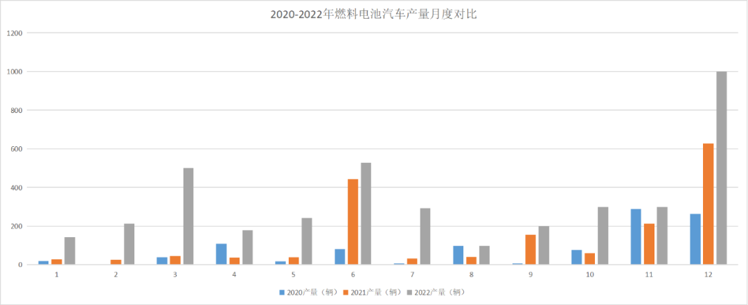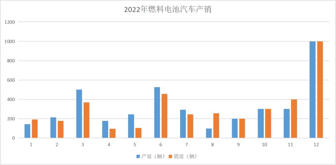 2020-2022年,燃料電池汽車產(chǎn)銷逐年遞增。氫能觀察統(tǒng)計,2020-2022年,燃料電池汽車產(chǎn)量分別完成1000輛、1742輛和4000輛;燃料電池汽車銷量分別完成1000輛、1556輛和3000輛。
