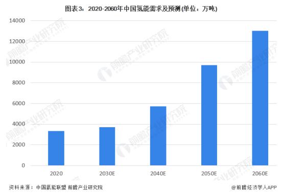 根據(jù)中國氫能聯(lián)盟的預測,2020 年以后中國氫能需求將持續(xù)增加,尤其是 2030 年以后,為達成 " 碳中和、碳達峰 " 的目標,氫能需求量將大增。到 2060 年,中國氫能年需求將超過 1.3 億噸。