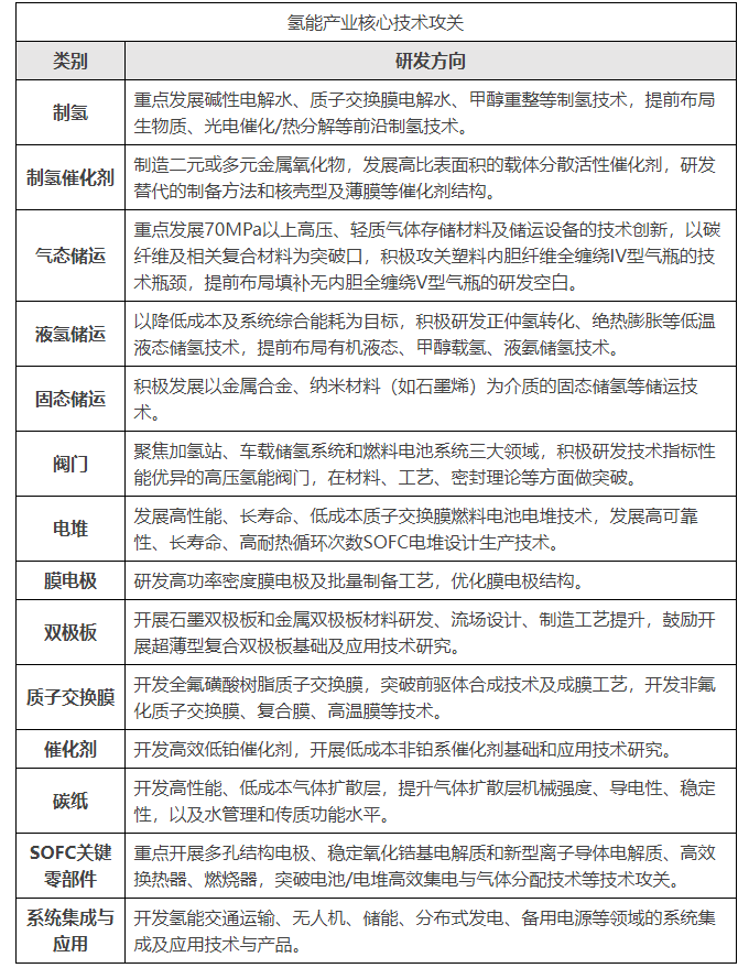 1.加快核心關(guān)鍵技術(shù)研發(fā)。以產(chǎn)業(yè)化為導(dǎo)向,推動核心技術(shù)的關(guān)鍵性能提升與綜合成本降低,實(shí)現(xiàn)核心技術(shù)與產(chǎn)品的自主可控。鼓勵(lì)創(chuàng)新多元化制氫工藝方式,重點(diǎn)發(fā)展高效率、長壽命、低成本的質(zhì)子交換膜電解水、甲醇重整等制氫技術(shù),提前布局生物質(zhì)、光電催化/熱分解等前沿制氫技術(shù)。重點(diǎn)發(fā)展70MPa以上高壓、輕質(zhì)氣體存儲材料及儲運(yùn)設(shè)備的技術(shù)創(chuàng)新,提前布局以液態(tài)化合物為介質(zhì)的液態(tài)儲氫和以合金、納米材料為介質(zhì)的固態(tài)儲氫等儲運(yùn)技術(shù)。重點(diǎn)開展高性能和低成本的質(zhì)子交換膜、膜電極、碳紙、催化劑等燃料電池關(guān)鍵材料和核心零部件的技術(shù)創(chuàng)新,實(shí)現(xiàn)燃料電池系統(tǒng)關(guān)鍵性能指標(biāo)達(dá)到國內(nèi)領(lǐng)先水平,綜合成本顯著降低。