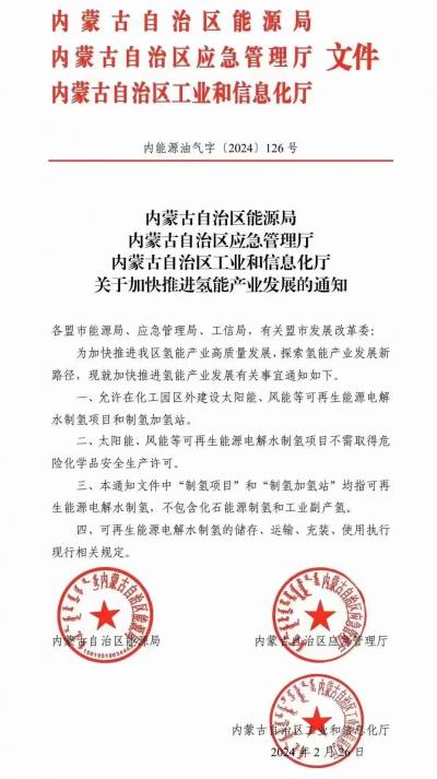 通知明確,允許在化工園區(qū)外建設(shè)太陽能、風(fēng)能等可再生能源電解水制氫項目和制氫加氫站。太陽能、風(fēng)能等可再生能源電解水制氫項目不需取得危險化學(xué)品安全生產(chǎn)許可。可再生能源電解水制氫的儲存、運輸、充裝、使用執(zhí)行現(xiàn)行相關(guān)規(guī)定。