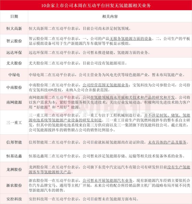 據(jù)財聯(lián)社不完全統(tǒng)計,恒大高新、智云股份、遠達環(huán)保、尤夫股份、中綠電、中南股份、南網(wǎng)能源、三一重工、信邦智能、恒基達鑫、龍洲股份、浙農(nóng)股份和安控科技在內(nèi)的13家上市公司本周在互動平臺無氫能源相關(guān)業(yè)務(wù)。具體情況如下圖: