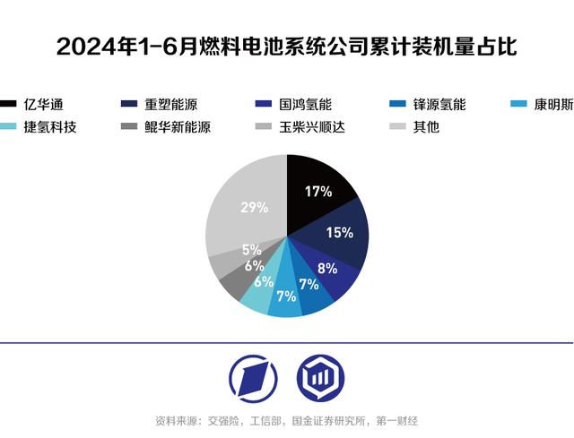 但燃料電池系統(tǒng)供應(yīng)商的競爭格局仍在不斷變化中。2024年1-6月,國內(nèi)燃料電池系統(tǒng)公司累計裝機(jī)量排名,億華通作為龍頭繼續(xù)保持第一,2-6名分別為重塑能源、國鴻氫能、鋒源氫能、康明斯、捷氫科技,而2023年2-6名分別為捷氫科技、重塑能源、國鴻氫能、濰柴動力、未勢能源。