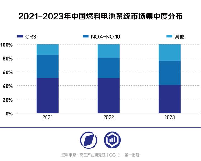 從燃料電池系統(tǒng)廠商裝機(jī)量來看,配套燃料電池汽車超過100臺的有15家,超過50臺的有23家,多達(dá)18家系統(tǒng)廠商配套數(shù)量不足10臺,也反映出國內(nèi)燃料電池市場集中度仍然較高,頭部企業(yè)享有更多訂單優(yōu)勢和規(guī)?;б?。