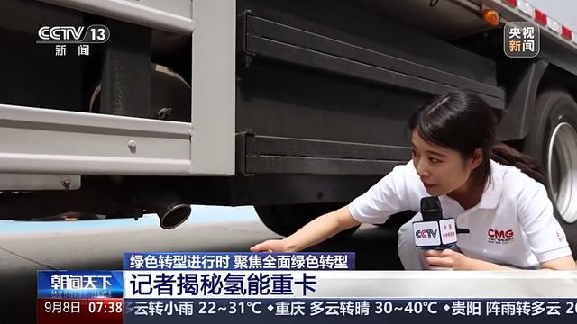 總臺(tái)央視記者 張叢婧:這個(gè)氫能重卡最大的不同就在于,您看在車頭和貨箱之間,有一個(gè)這樣的大箱子,里面裝的就是氫燃料。