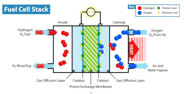 氫燃料電池工作原理是氫氣通過燃料電池正極當(dāng)中的催化劑(鉑)分解成電子和氫離子(質(zhì)子)。其中質(zhì)子通過質(zhì)子交換膜(Proton Exchange Membrane)到達(dá)負(fù)極和氧氣反應(yīng)變成水和熱量。對應(yīng)的電子則從正極通過外電路流向負(fù)極產(chǎn)生電能。