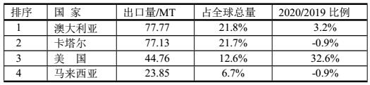 2020年LNG生產(chǎn)國共計出口356.12MT,2020年LNG出口最多的前4位國家如表。表明最大出口國是澳大利亞和卡塔爾,但增幅美國最大。