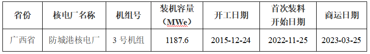1)防城港核電廠3號機(jī)組2023年3月25日商運,機(jī)組2023年調(diào)試期間累計發(fā)電量、上網(wǎng)電量分別為8.02413億度、7.47180億度。