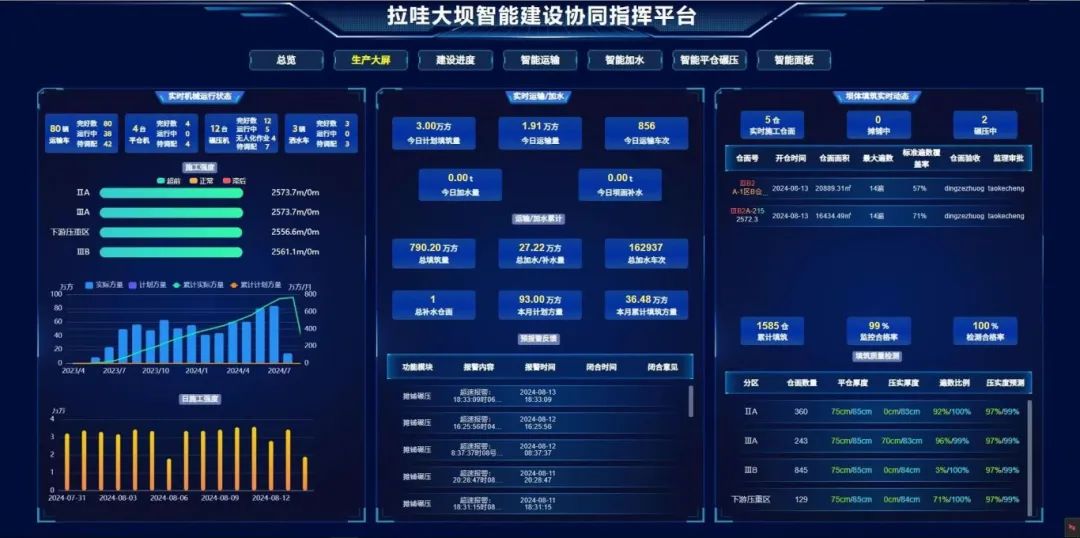 為保障世界級工程高效率高質(zhì)量建設(shè),項(xiàng)目團(tuán)隊(duì)不斷優(yōu)化施工規(guī)劃,全面應(yīng)用無人碾壓、智能物料、智能加水、智能攤鋪等技術(shù)聯(lián)動(dòng)的智慧大壩協(xié)同指揮平臺,全方位提升大壩填筑效率與質(zhì)量。截至目前,拉哇水電站大壩日填筑方量已突破3萬方,月填筑方量接近100萬方,月上升高度超過13.2米,為目前國內(nèi)上升速度最快的混凝土面板堆石壩。