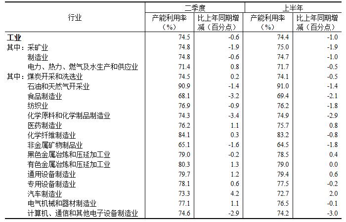 二季度,全國工業(yè)產(chǎn)能利用率為74.5%,比一季度上升0.2個百分點。