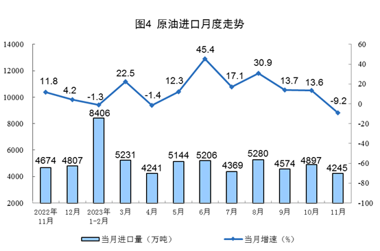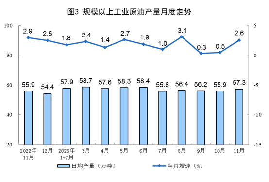原油生產(chǎn)增速加快,進口增速由增轉(zhuǎn)降。11月份,生產(chǎn)原油1720萬噸,同比增長2.6%,增速比10月份加快2.1個百分點,日均產(chǎn)量57.3萬噸。進口原油4245萬噸,同比下降9.2%,10月份為增長13.6%。