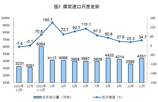 原煤生產(chǎn)有所加快,進口較快增長。11月份,生產(chǎn)原煤4.1億噸,同比增長4.6%,增速比10月份加快0.8個百分點,日均產(chǎn)量1379.9萬噸。進口煤炭4351萬噸,同比增長34.7%,增速比10月份加快11.4個百分點。