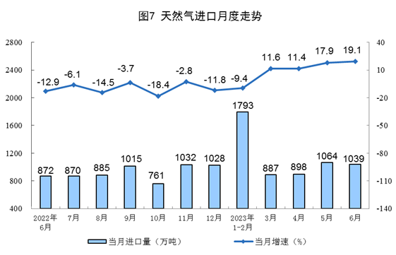 天然氣生產(chǎn)平穩(wěn)增長,進(jìn)口增速較快。上半年,生產(chǎn)天然氣1155億立方米,同比增長5.4%。進(jìn)口天然氣5663萬噸,同比增長5.8%。6月份,生產(chǎn)天然氣183億立方米,同比增長5.5%。