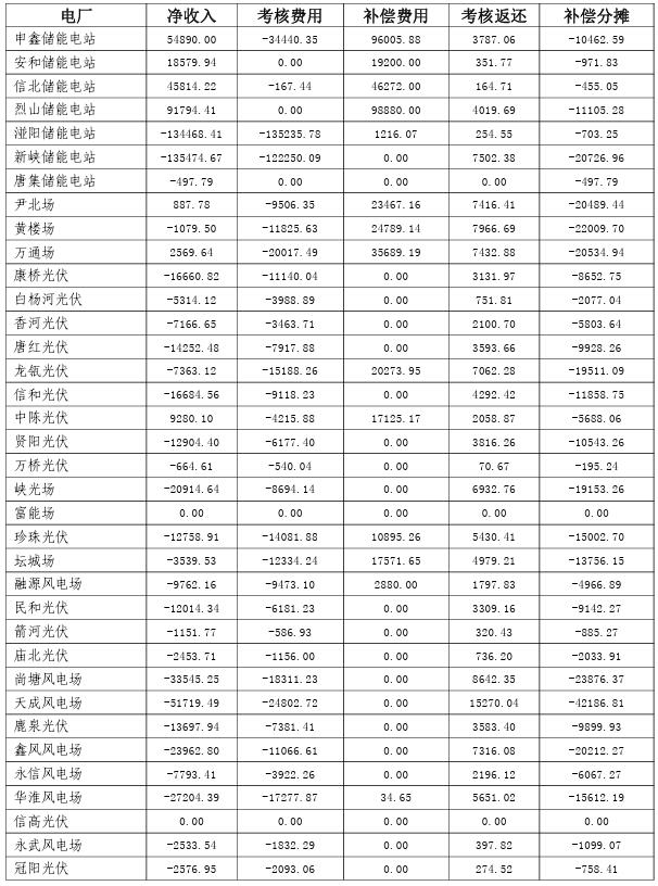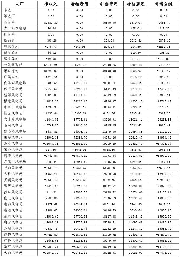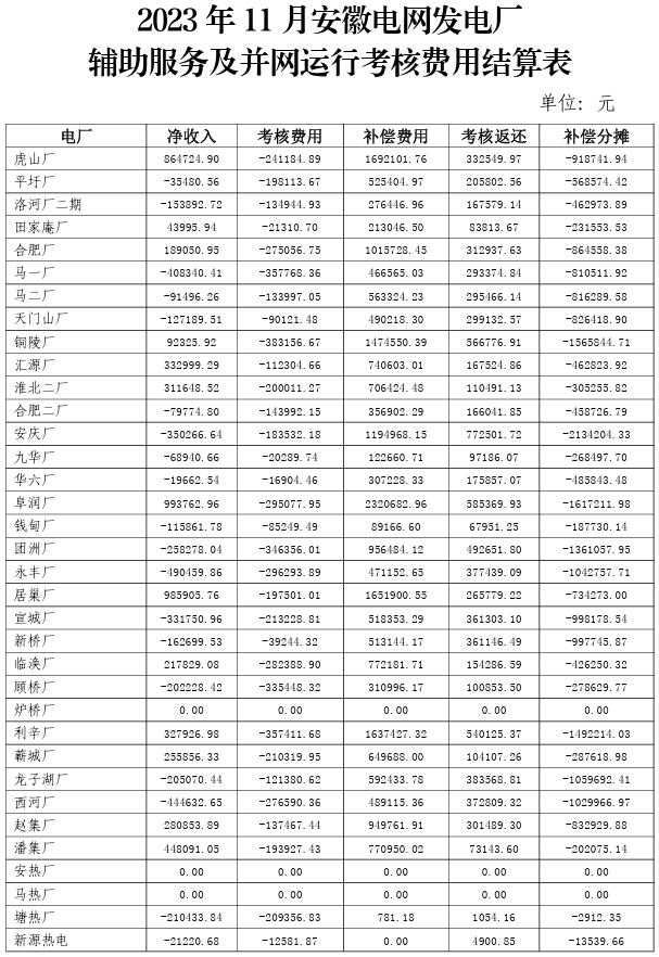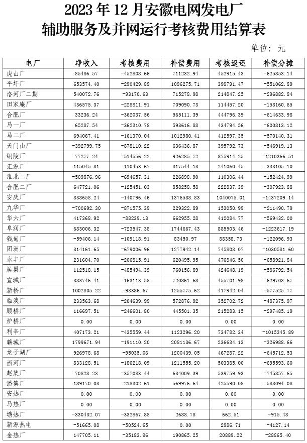 根據(jù)華東區(qū)域“兩個(gè)細(xì)則”規(guī)則要求,國(guó)網(wǎng)安徽省電力有限公司完成了2023年10-12月直調(diào)電廠(chǎng)并網(wǎng)運(yùn)行考核、輔助服務(wù)補(bǔ)償統(tǒng)計(jì)計(jì)算,并向我局報(bào)送了并網(wǎng)運(yùn)行考核及輔助服務(wù)補(bǔ)償情況。其中,吉泉直流配套跨省跨區(qū)新建火電機(jī)組調(diào)試運(yùn)行期差額資金共計(jì)8882813.74元,納入12月輔助服務(wù)補(bǔ)償。2023年10-12月安徽電網(wǎng)發(fā)電廠(chǎng)輔助服務(wù)補(bǔ)償及并網(wǎng)運(yùn)行考核費(fèi)用結(jié)算表詳見(jiàn)附件,現(xiàn)予公示。如有不同意見(jiàn),可于3月1日前向我局反映。