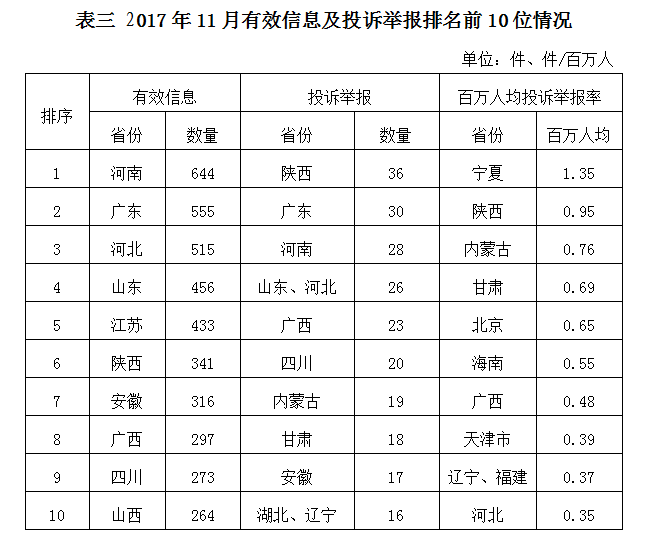2017年11月,各省(自治區(qū)、直轄市)按照有效信息數(shù)量排序,河南、廣東、河北等省列全國(guó)前10位;按照投訴舉報(bào)數(shù)量排序,陜西、廣東、河南等省排在全國(guó)前10位;按照百萬(wàn)人均投訴舉報(bào)率排序,寧夏,陜西,內(nèi)蒙古等省位于全國(guó)前10位。(2017年11月有效信息及投訴舉報(bào)排名前10位情況見表三)