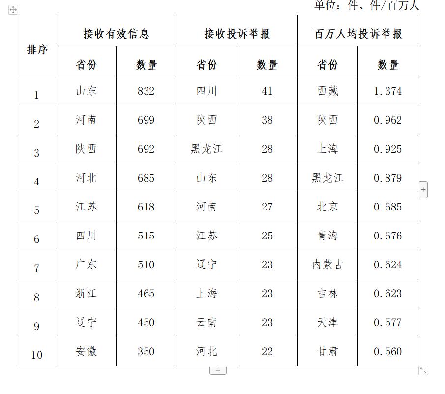 各省(自治區(qū)、直轄市)按照接收的有效信息數(shù)量排序,山東、河南、陜西、河北、江蘇、四川、廣東、浙江、遼寧、安徽排在全國前10位;按照接收的投訴舉報(bào)數(shù)量排序,四川、陜西、黑龍江、山東、河南、江蘇、遼寧、上海、云南、河北排在全國前10位;按照百萬人均投訴舉報(bào)數(shù)量排序,西藏、陜西、上海、黑龍江、北京、青海、內(nèi)蒙古、吉林、天津、甘肅排在全國前10位。(2023年2月有效信息及投訴舉報(bào)排名前10位情況見表三)